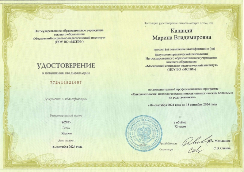 2024 - Онкопсихология: Психологическая помощь онкобольным и их родственникам. Московский социально-педагогический институт совместно с АНО Служба "Ясное утро"