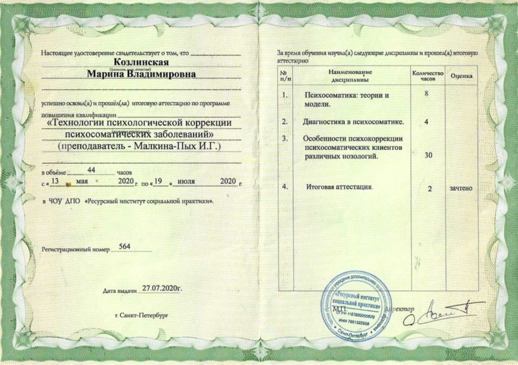 2020 - Психологическая коррекция психосоматических заболеваний. Ресурсный институт социальной практики (И.Г.Малкина-Пых)